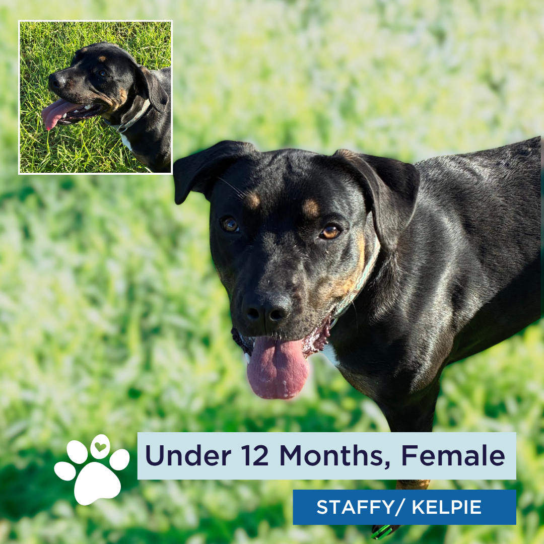 StarMeet Star – a beautiful Staffy x Kelpie mix with striking black and tan markings, and under a year old. This lovely young girl is looking for a home.