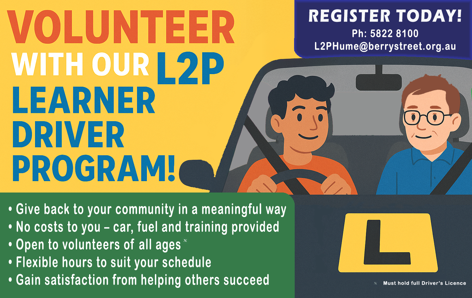 If you’re interested, please log into your VicRoads account, click on licences, down the bottom, apply as a Learner for the L2P program – Berry Street Strathbogie.