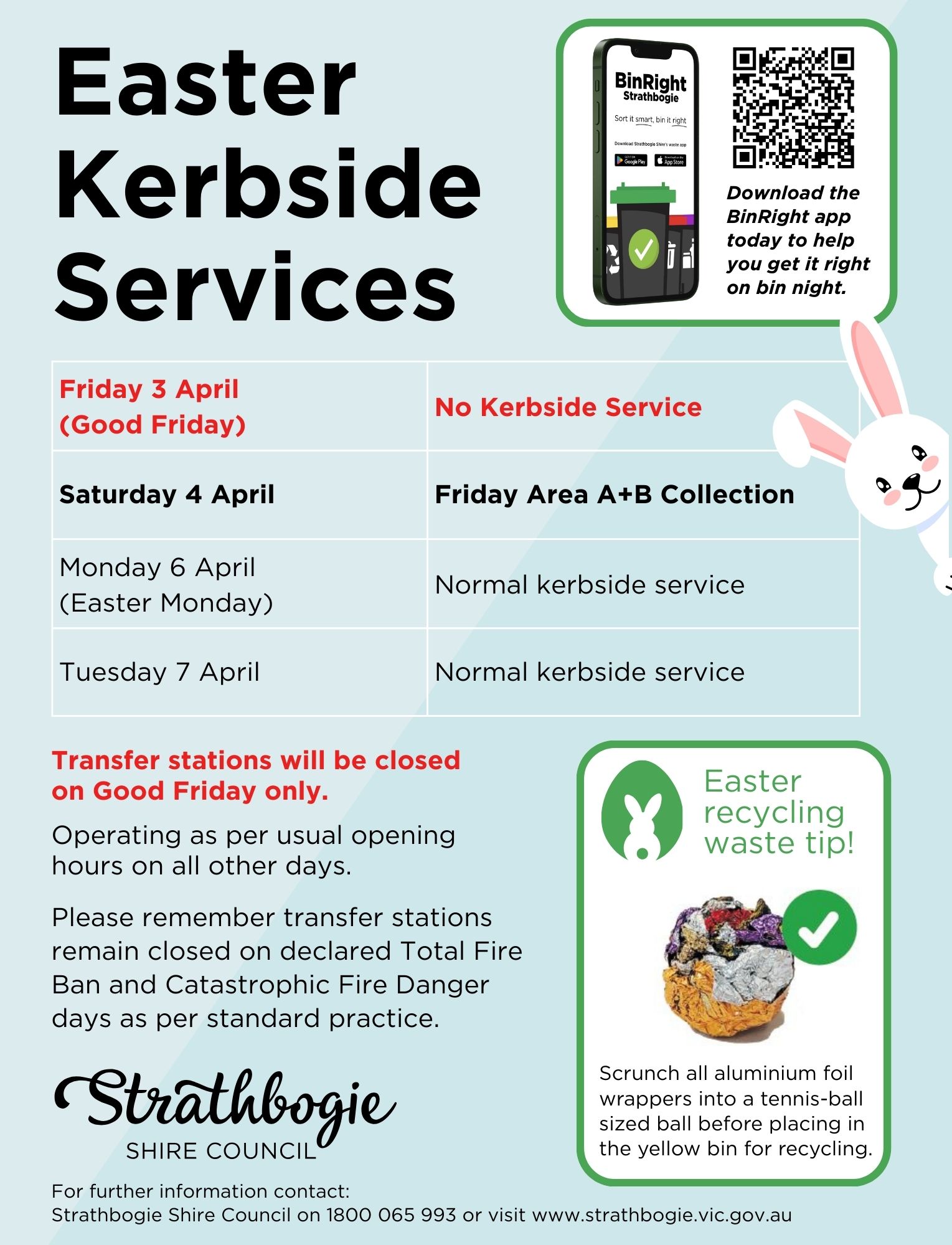 Please note: Transfer stations remain closed on declared Total Fire Ban and Catastrophic Fire Danger days, in line with standard practice.