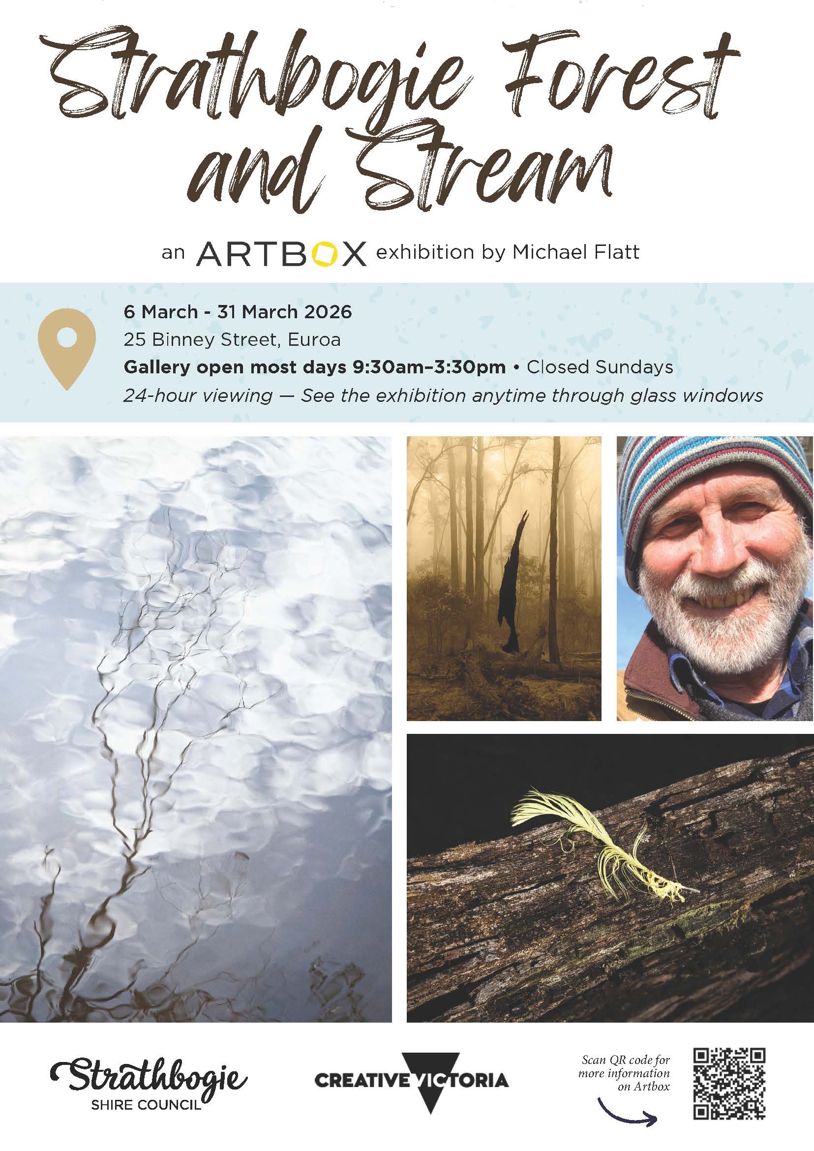 Strathbogie Forest and Stream brings together a decade of photographs taken across the Strathbogie tablelands. Featuring landscapes, textures and quiet moments, the exhibition reflects the natural beauty of the region and Michael Flatt’s deep personal connection to the place he calls home.“I’ve selected my favourite images taken over ten years,” Michael says. “These works reflect the subjects I’m drawn to and my love of the Strathbogie tablelands.”Artbox’s return to Euroa marks its third visit and a welcome addition to the main street, offering residents, visitors and traders an accessible arts experience throughout March.