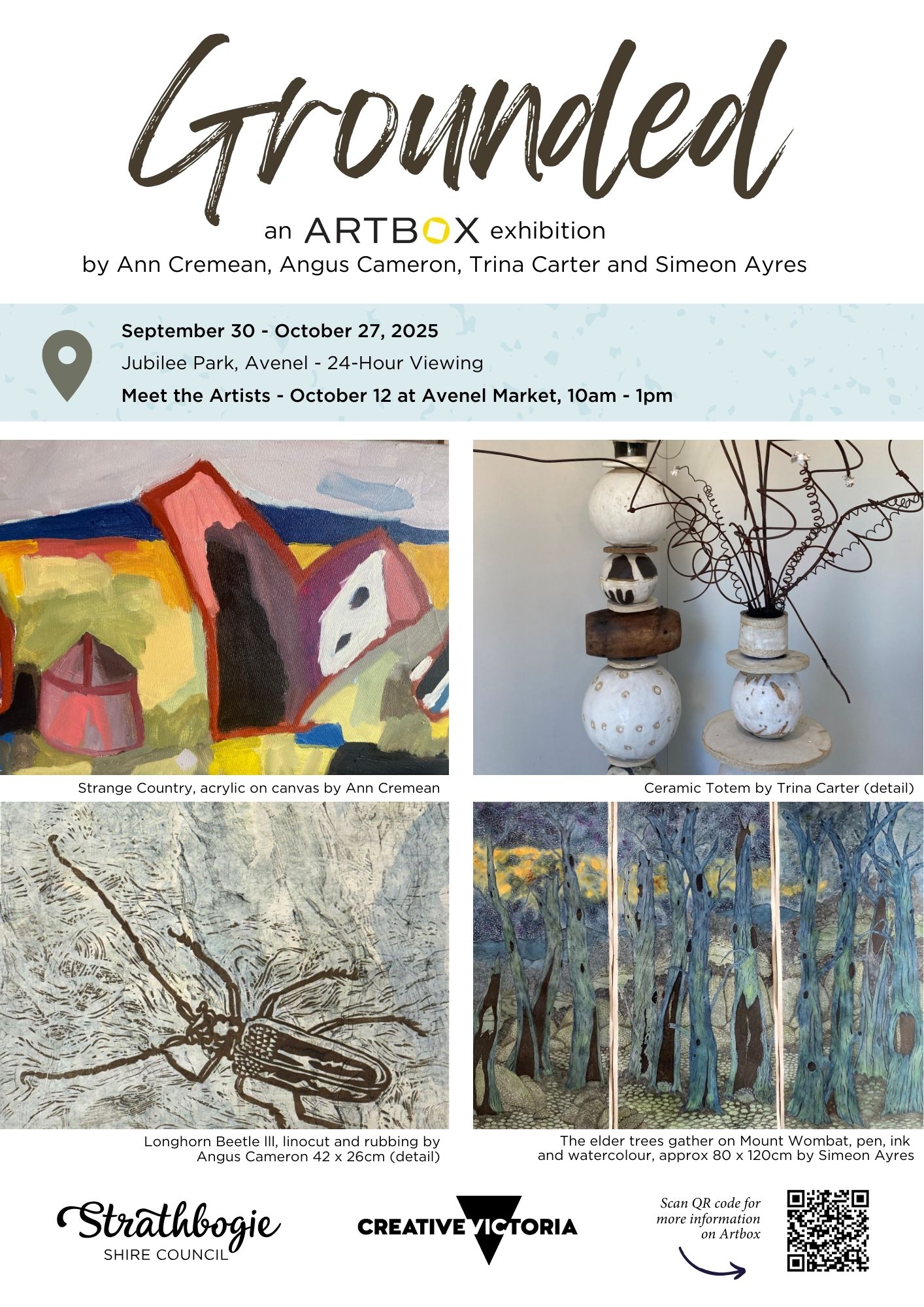 All artworks will be available for purchase or simply for your viewing pleasure. Visitors are encouraged to drop by on Avenel Market Day, October 12, when the artists will be present at Artbox from 10am to 1pm for informal discussion and insights into their creative processes.